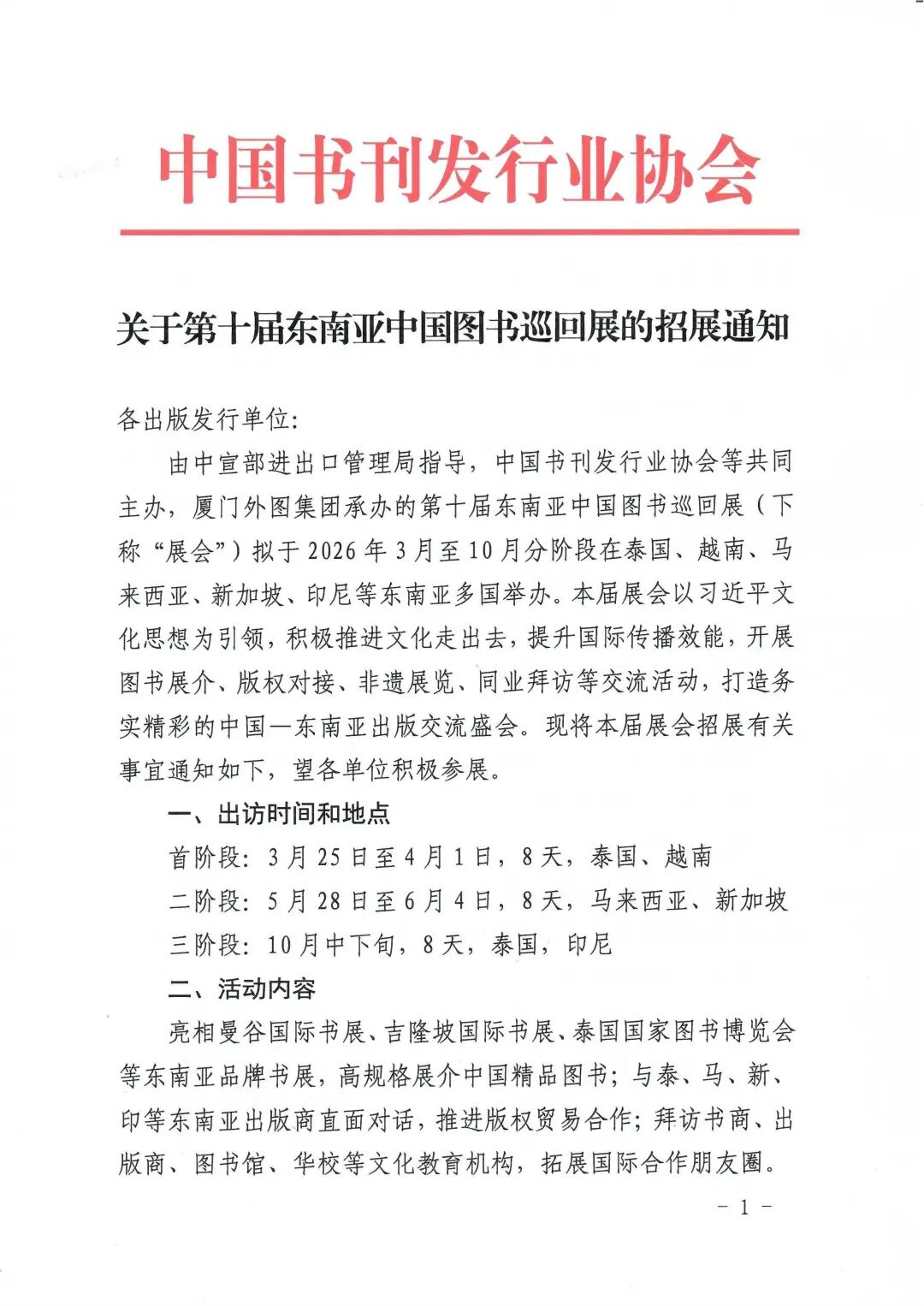 由中宣部进出口管理局指导,中国书刊发行业协会等共同主办,厦门外图集团承办的第十届东南亚中国图书巡回展(下称“展会”)拟于2026年3月至10月分阶段在泰国、越南、马来西亚、新加坡、印尼等东南亚多国举办。本届展会以习近平文化思想为引领,积极推进文化走出去,提升国际传播效能,开展图书展介、版权对接、非遗展览、同业拜访等交流活动,打造务实精彩的中国—东南亚出版交流盛会。现将本届展会招展有关事宜通知如下,望各单位积极参展。