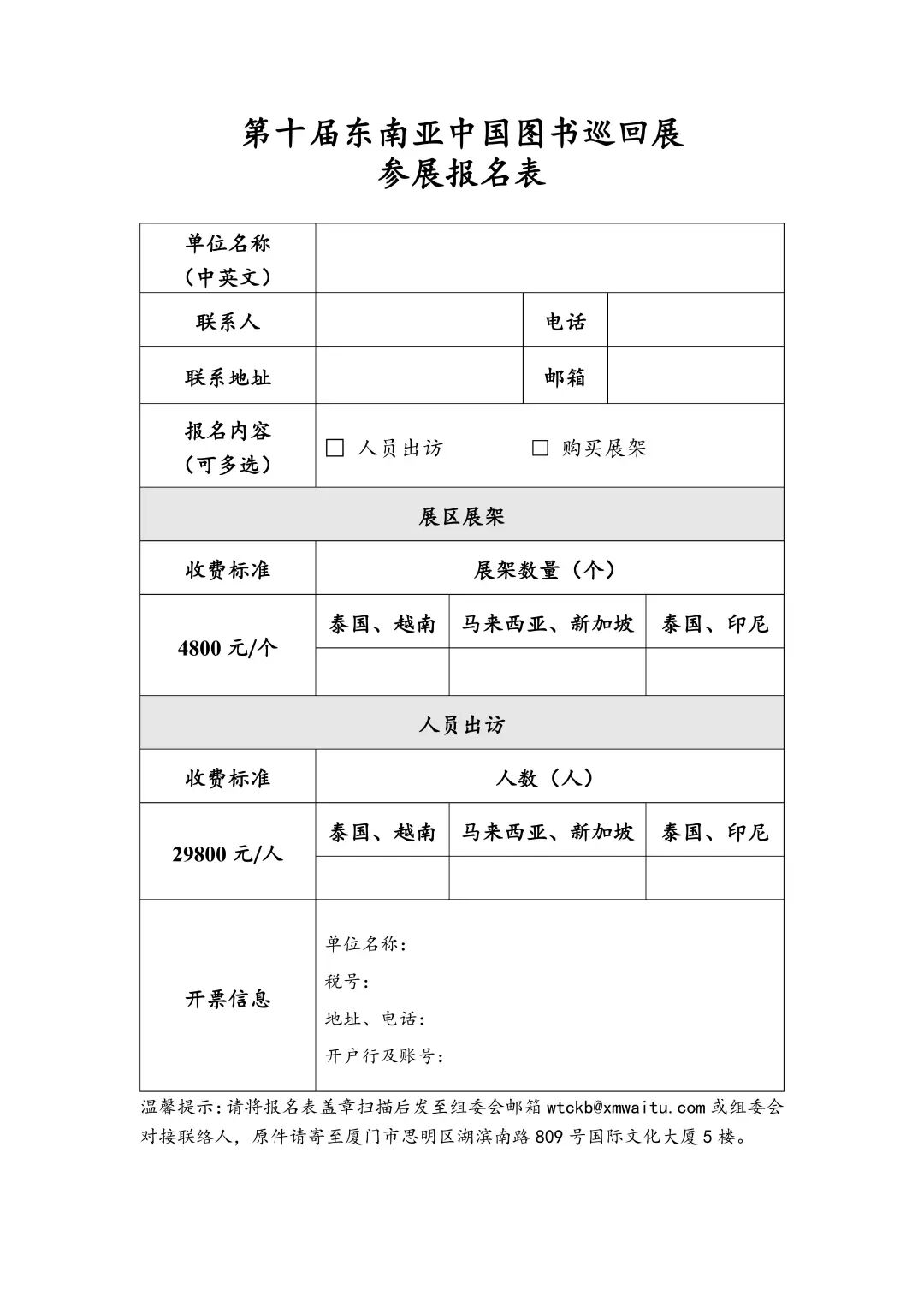 请各意向单位填写报名表,加盖公章后将电子扫描件发送组委会邮箱。完成报名后,请按需提供参展产品版权推介材料,寄送参展样品,由组委会统一安排运抵海外会场。
