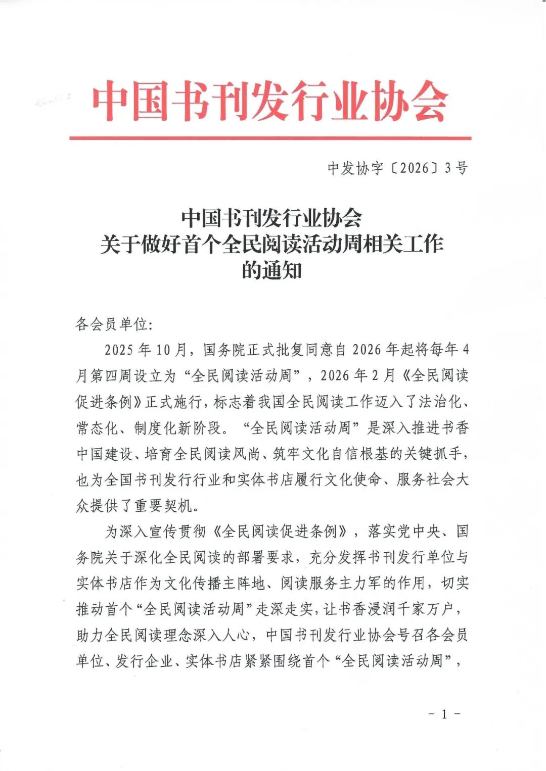2025年10月,国务院正式批复同意自2026年起将每年4月第四周设立为“全民阅读活动周”,2026年2月《全民阅读促进条例》正式施行,标志着我国全民阅读工作迈入了法治化、常态化、制度化新阶段。“全民阅读活动周”是深入推进书香中国建设、培育全民阅读风尚、筑牢文化自信根基的关键抓手,也为全国书刊发行行业和实体书店履行文化使命、服务社会大众提供了重要契机。