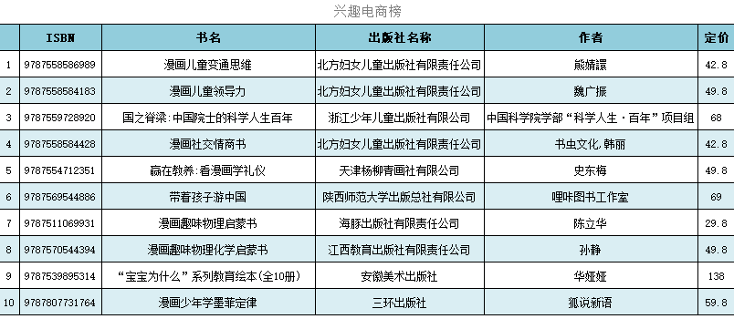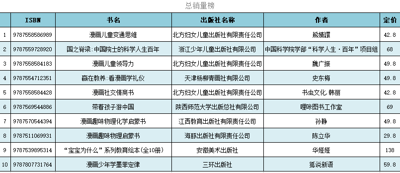 少儿类:“漫画+”图书热度不减,激发阅读兴趣是关键发力点2024年8月,少儿市场中“漫画+”图书依旧持有较为突出的市场热度。《漫画儿童变通思维》位列总销量榜和兴趣电商榜首位,总销量榜前30名中有14种为“漫画+”图书。货架销售榜中,少儿主题出版物《国之脊梁:中国院士的科学人生百年》排在首位,“大中华寻宝系列”推出的新书《吉林寻宝记》位列第二。纵观本期榜单,无论是“漫画+”、游学主题还是翻翻书,都呈现出尊重少儿读者身心发展特点,以兴趣为导向的阅读趋势。
