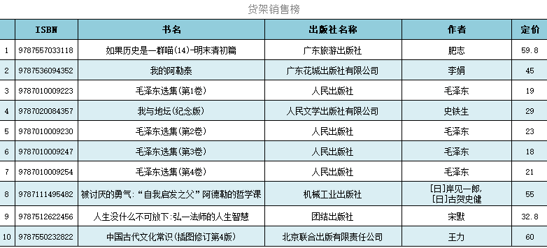 红色书籍掀起热销潮。在快节奏、略有浮躁的现代社会,许多人渴望寻找支撑的精神力量以减少迷茫焦虑,凝结一代伟人和集体智慧结晶的“毛泽东选集”(共4卷)契合当下需求,读者可以在回顾中国革命艰辛历程的同时,从中寻找对应现实问题的经验教训。本期“毛泽东选集”第1卷至4卷均进入货架销售榜前7位。