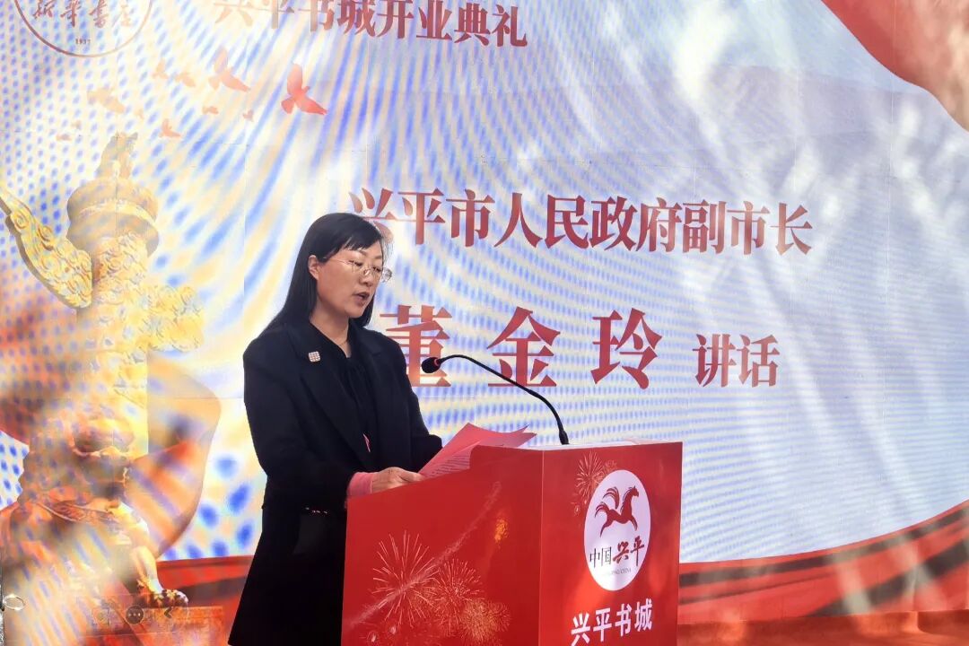 董金玲向重装开业的兴平书城表示祝贺,指出兴平书城的转型升级是兴平市文化建设和精神文明建设的一件喜事,有力地提升了兴平市的文化形象,丰富了群众的文化生活。希望兴平市新华书店进一步解放思想,创新经营模式,更好地服务社会、服务读者,为促进全民阅读、构建和谐社会、打造“书香兴平”做出更大的贡献。