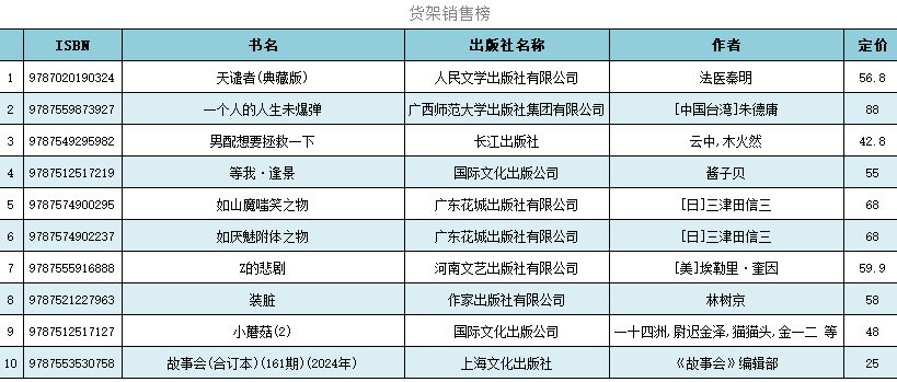 推理悬疑作品获市场关注。本期多部推理悬疑作品进入新书榜单。法医秦明再版作品《天谴者 (典藏版)》在内容上进行了30%深度修订并新增2起诡案,凭借扣人心弦的情节、紧张刺激的氛围营造以及精彩的推理过程,吸引了大量悬疑推理小说爱好者的关注,位列货架销售新书榜榜首及总销量新书榜第2名。除此之外三津田信三的《如山魔嗤笑之物》《如厌魅附体之物》和埃勒里·奎因的《Z的悲剧》也有不错表现,进入货架销售新书榜前10名。11月虚构类各渠道新书销量TOP10
