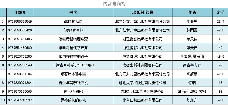 2024年11月少儿类新书市场中,《战胜拖延症》位居总销量新书榜和内容电商新书榜首位,货架销售新书榜榜首书为《影响世界的100个大事件》。心理健康类图书仍是市场关注重点。本期青少年心理自助类图书《战胜拖延症》《你好!青春期》和《做内核稳定的孩子》均进入少儿总销量新书榜前5名。在青少年成长过程中,个人习惯和心理健康问题日益凸显,家长和青少年自身都对这方面的知识有着迫切需求。《战胜拖延症》通过实用的方法指导和生动有趣的案例,帮助青少年认识拖延的危害,掌握克服拖延的技巧,培养良好的时间管理和自我管理能力。《你好!青春期》则聚焦青春期孩子的特点,用专业的知识解决孩子青春期面临的种种问题。《做内核稳定的孩子》从培养孩子心向美好、不慌不忙、从容长大等角度出发,面对孩子成长中的问题,让孩子学会独自解决问题的能力。系列图书在货架销售榜中表现突出。双十一大促期间,线上渠道有着大量的促销活动,一定程度上带动了少儿系列图书的销售,除价格因素外,系列图书往往具有一定的品牌效应和读者基础,在大促期间消费者更倾向于购买这类他们熟悉且信任的图书。本期货架销售新书榜前10名中,除《影响世界的100个大事件》外,全部为系列图书作品,其中包括“白狼星探险队.探险启航篇”的4个分册、“大英儿童百科·知识闯关卡”的3个分册及“名侦探柯南”“哈小浪上学记”系列各1个分册。11月少儿类各渠道新书销量TOP10