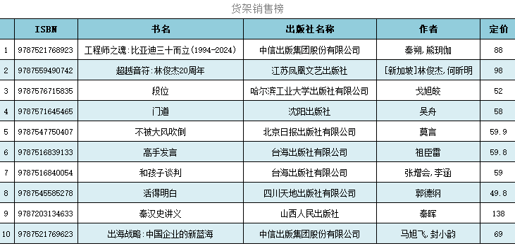 企业管理与成功学热度高。《工程师之魂:比亚迪三十而立(1994-2024)》本期在总销量新书榜和货架销售新书榜均位列榜首,在当前经济环境下,企业的成功经验备受关注,该书聚焦比亚迪的发展历程,剖析了其在企业文化、技术创新与产品研发、新能源市场战略、组织变革、社会责任、品牌建设等方面的策略和实践,为其他企业提供了宝贵的经验,吸引了对汽车行业、企业管理感兴趣的读者。《段位》本期位列总销量新书榜第2名、内容电商新书榜榜首和货架销售新书榜第3名,本书从不同角度出发,帮助读者提升自己在各个领域的“段位”,满足了人们追求成功、突破自我的心理需求,体现了市场对相关内容的需求。粉丝效应带动相关图书热销。粉丝效应在图书市场中具有强大的影响力,当娱乐人物获得广泛认可时,其粉丝群体便会展现出强大的集聚效应和消费能力,进而影响到相关图书的销售。歌手林俊杰出道二十年来的首部个人传记《超越音符:林俊杰20周年》由林俊杰和编剧何昕明共同创作完成,全书以三幕剧的形式讲述林俊杰的过去、现在和未来,本期位居货架销售新书榜第2名和总销量新书榜第8名。郭德纲以其独特的幽默感和智慧,本期带来了新作《活得明白》,书中除记录郭德纲的人生感悟外,更与读者展开了心灵沟通,深入分享了如何以一种豁达、清醒的心态,去应对生活中的种种挑战和风雨,本期在总销量新书榜、货架销售新书榜及内容电商新书榜均进入前10名。